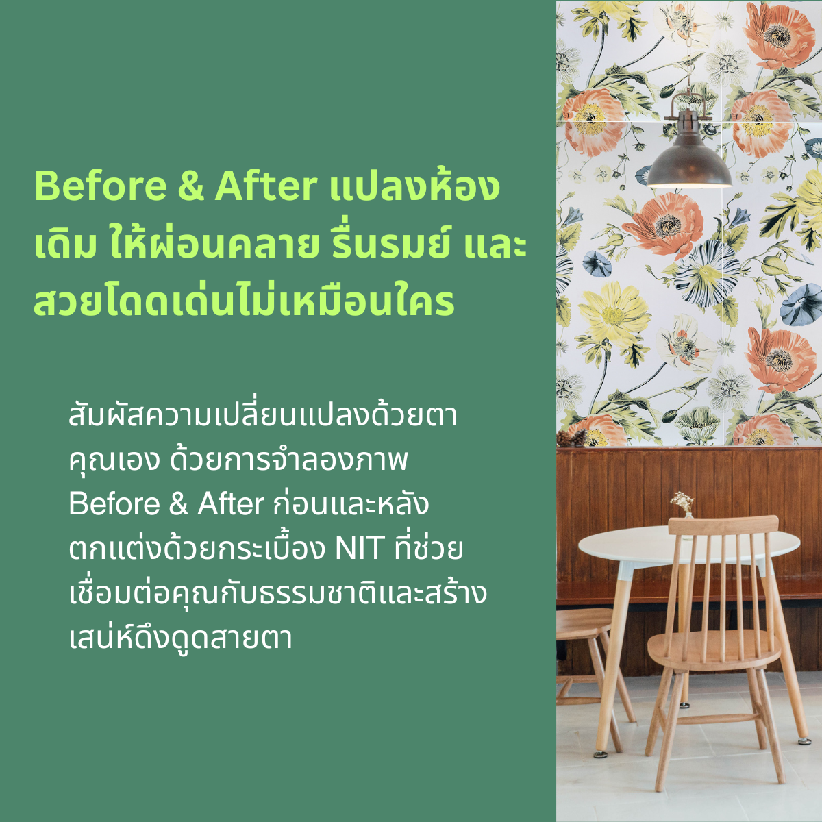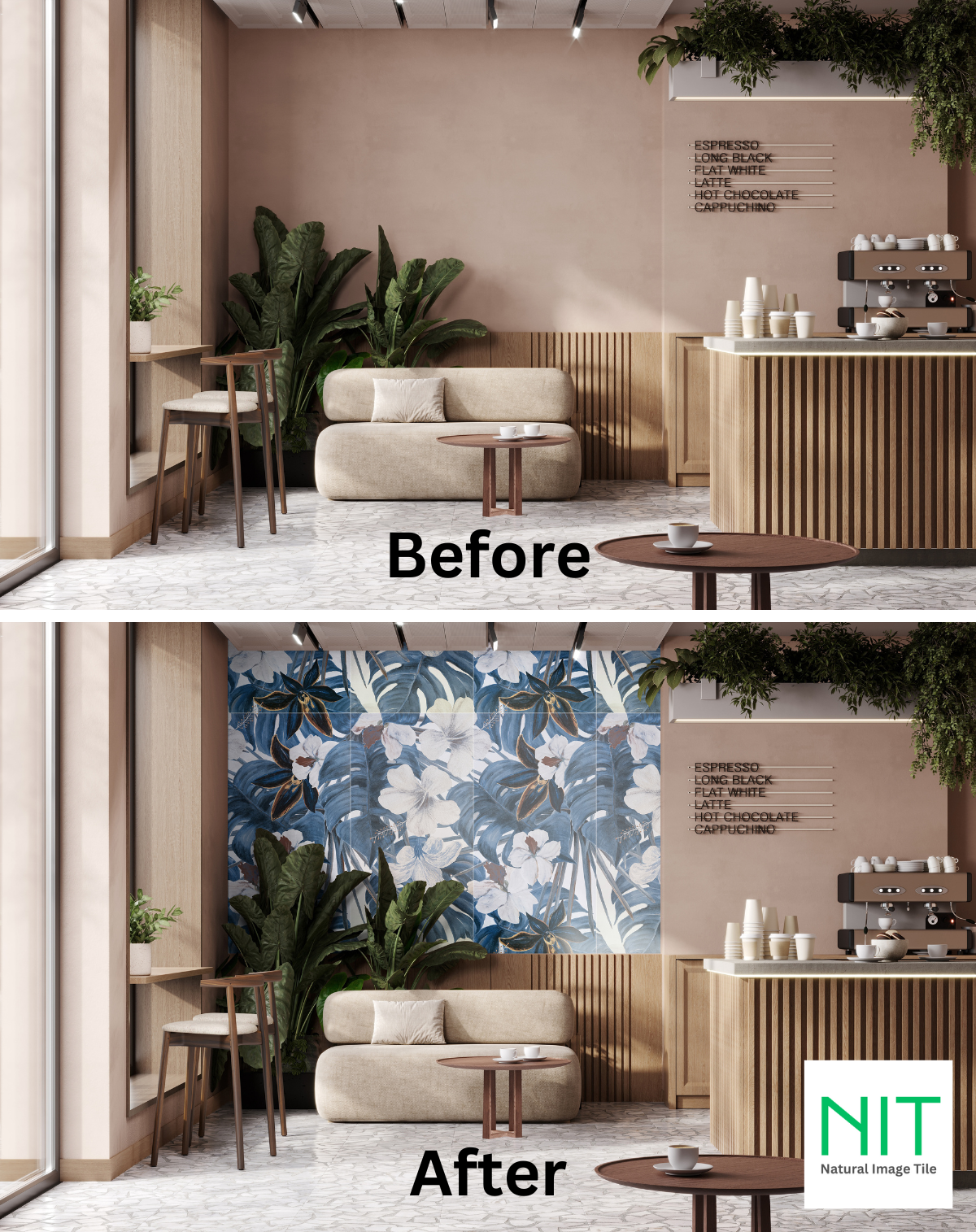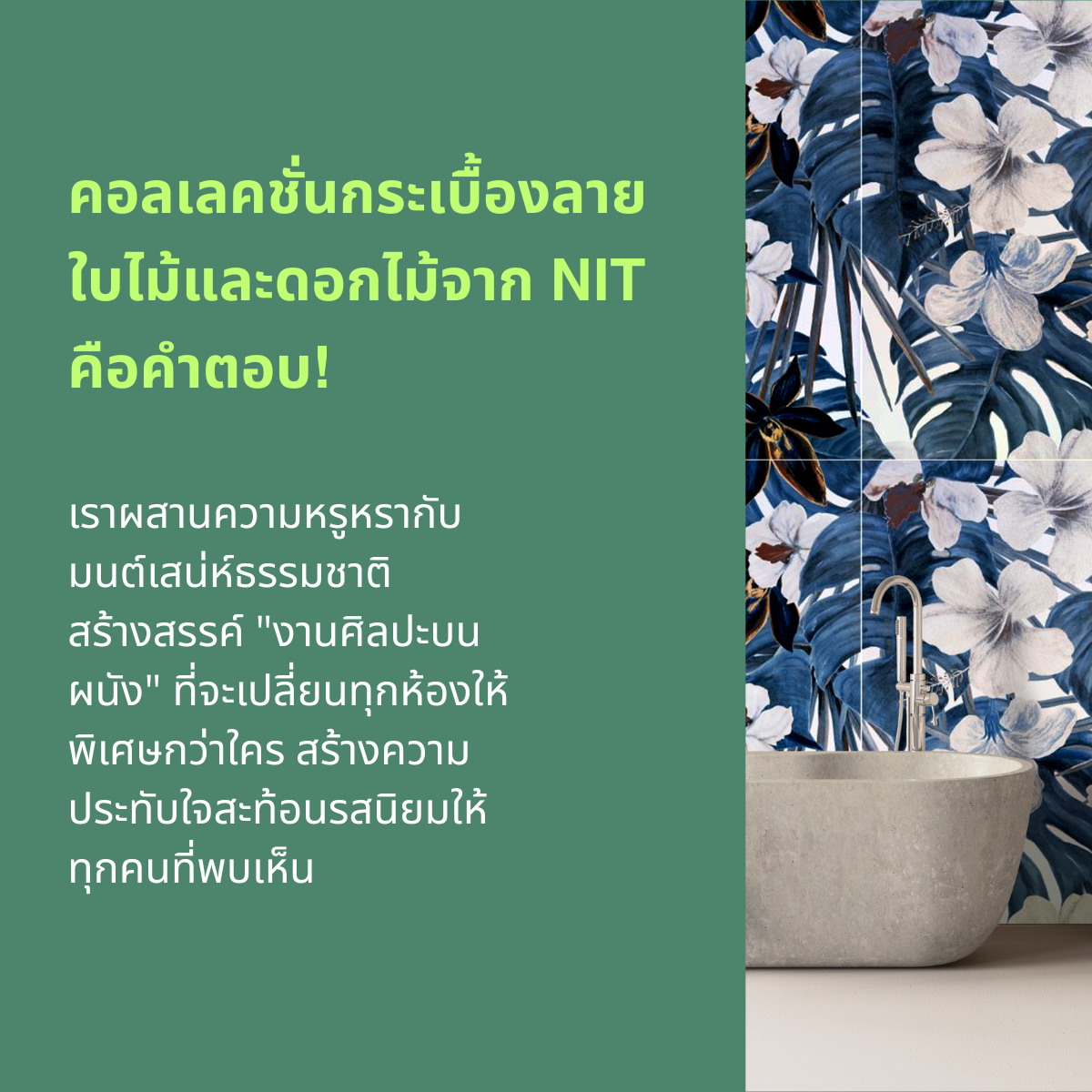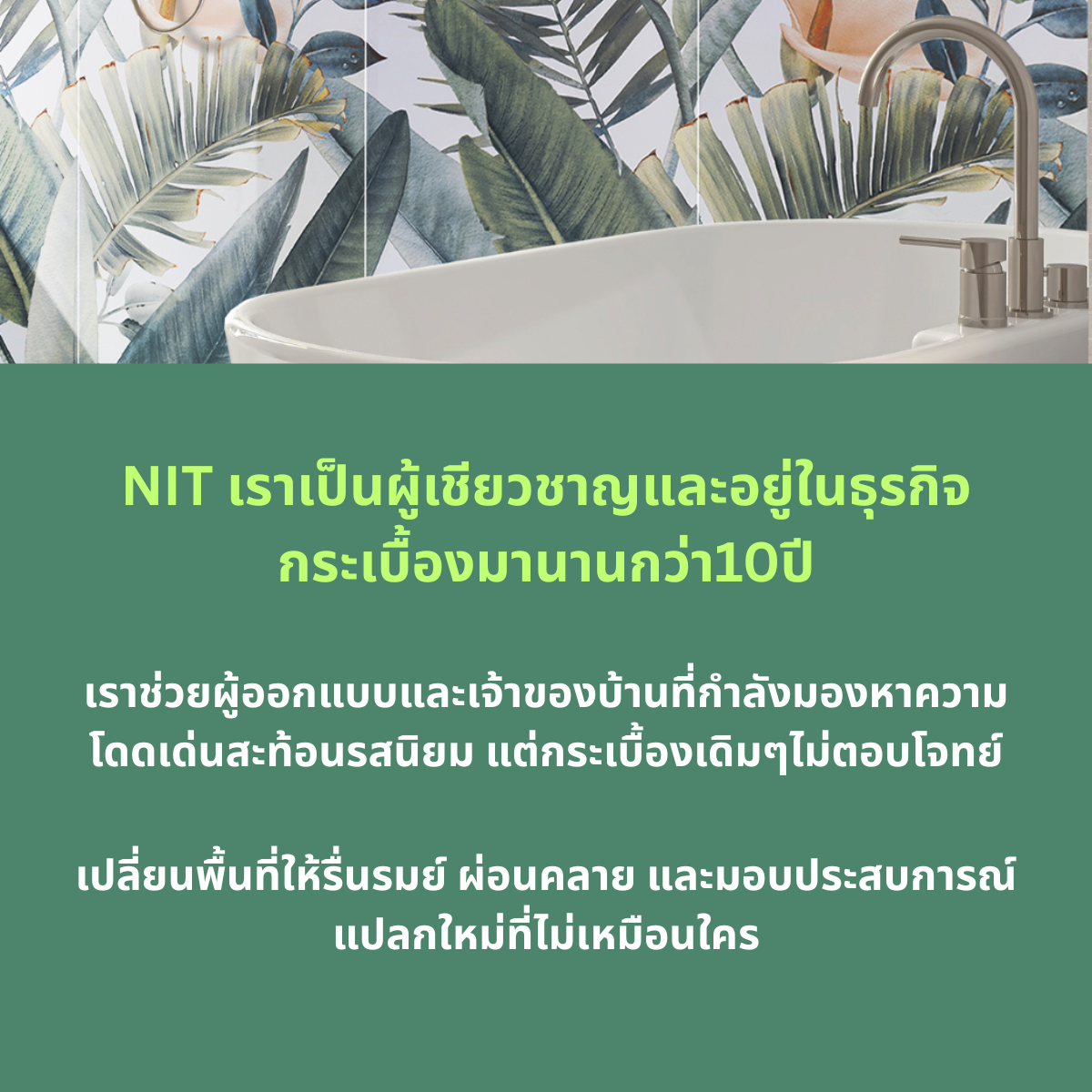 NIT DESIGN เป็นผู้เชียวชาญและอยู่ในธุรกิจกระเบื้องมานานกว่า10ปี เราช่วยผู้ออกแบบและเจ้าของบ้านที่กำลังมองหาความแปลกใหม่ แต่กระเบื้องตกแต่งเดิมๆไม่ตอบโจทย์ เราขอแนะนำกระเบื้องลายธรรมชาติ 60x120cm รอยต่อน้อย หรูหรา ลวดลายดูต่อเนื่อง ลายถูกออกแบบให้โดดเด่นดูแตกต่าง ลายต่อเนื่องไม่ซ้ำ 2-6 แผ่นเพิ่มความแปลกใหม่ เปลี่ยนพื้นที่ให้รู้สึกรื่นรมย์ผ่อนคลาย และมอบประสบการณ์แปลกใหม่ที่ไม่เหมือนใคร